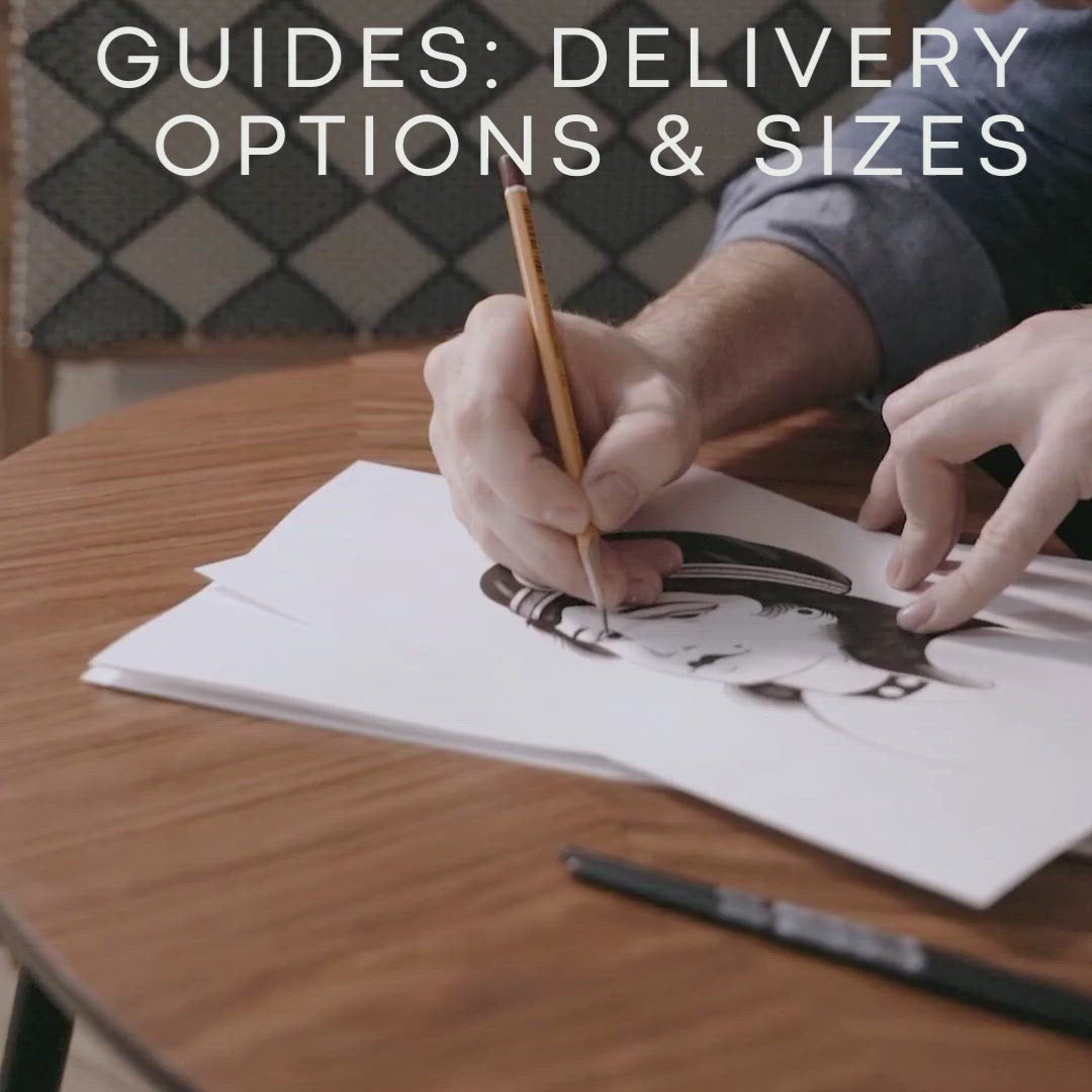 Check out the last video in the gallery at the side to see other examples of this style. The video gallery also includes guide videos on choosing the best photos, our drawing size/delivery options, and the order journey.